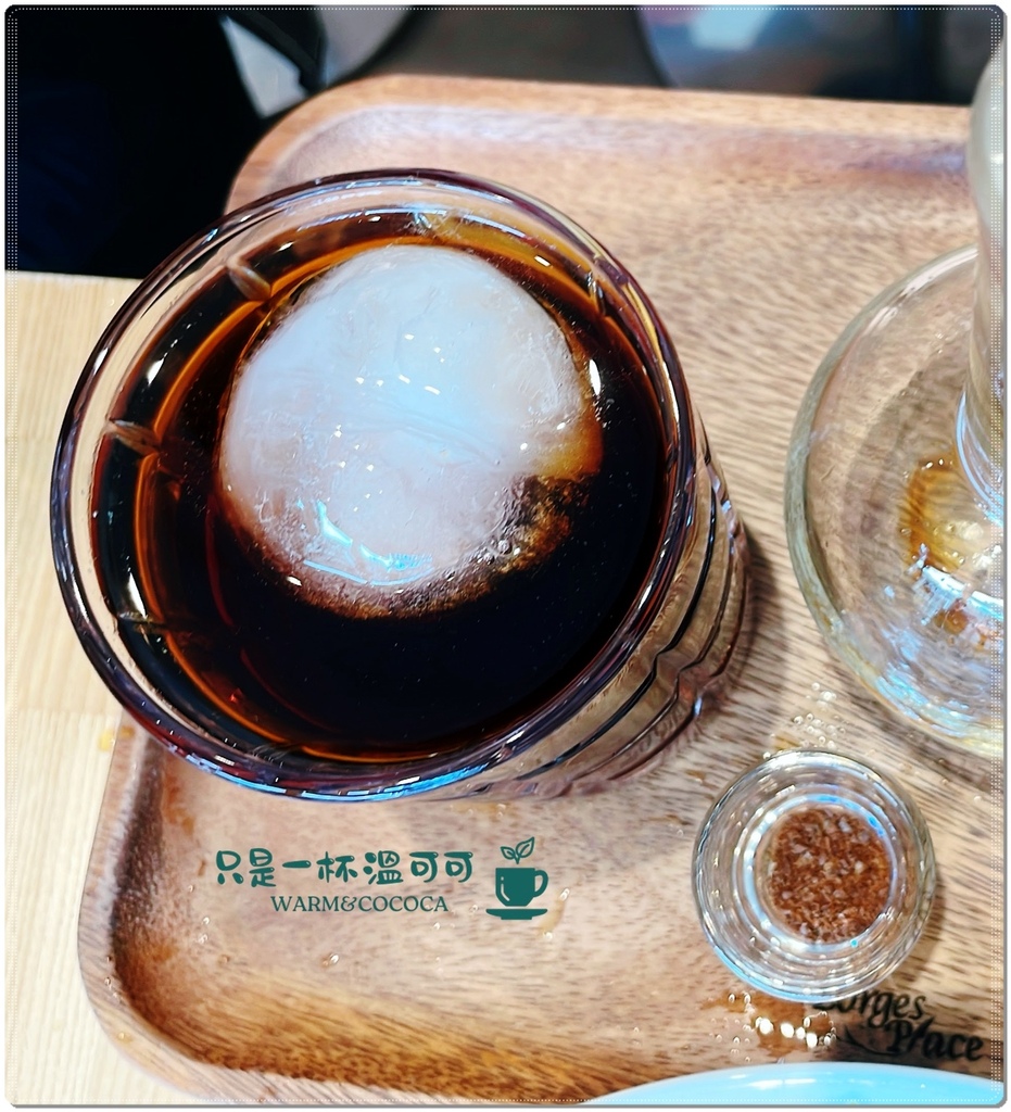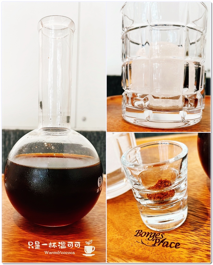 這個燒杯是倒在有冰球的威士忌杯子裡面,小杯子是聞香杯,讓我享受咖啡的乾香,深吸口氣有濃濃的花香味
