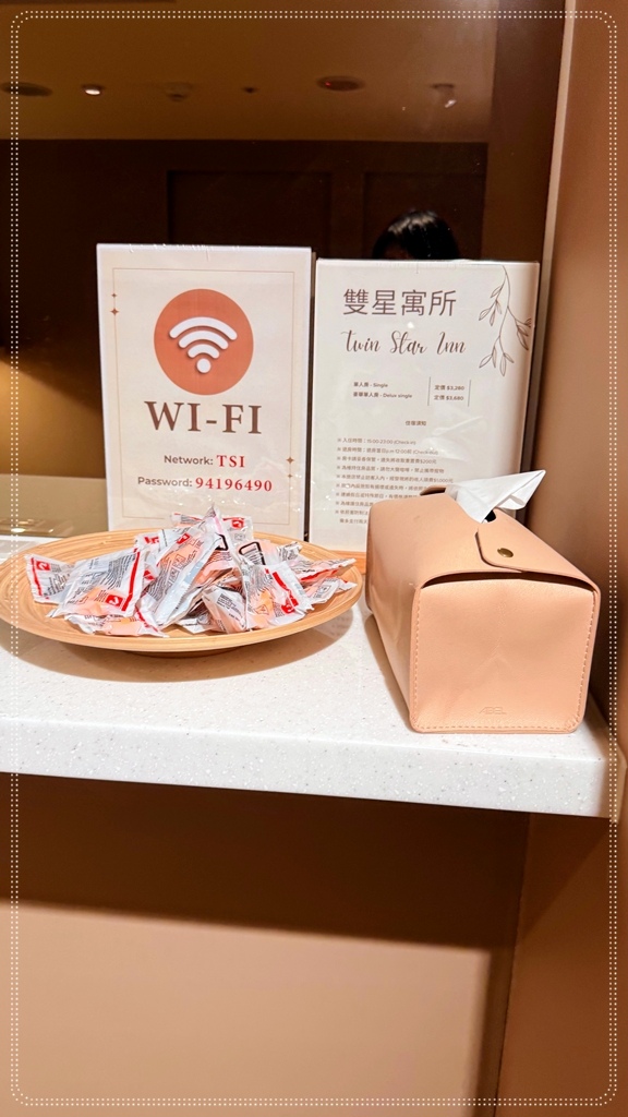 我這次住的是雙星寓所的豪華單人房,307號房,上面還有WiFi帳號密碼也太貼心了吧!
