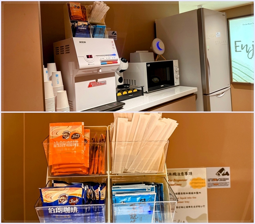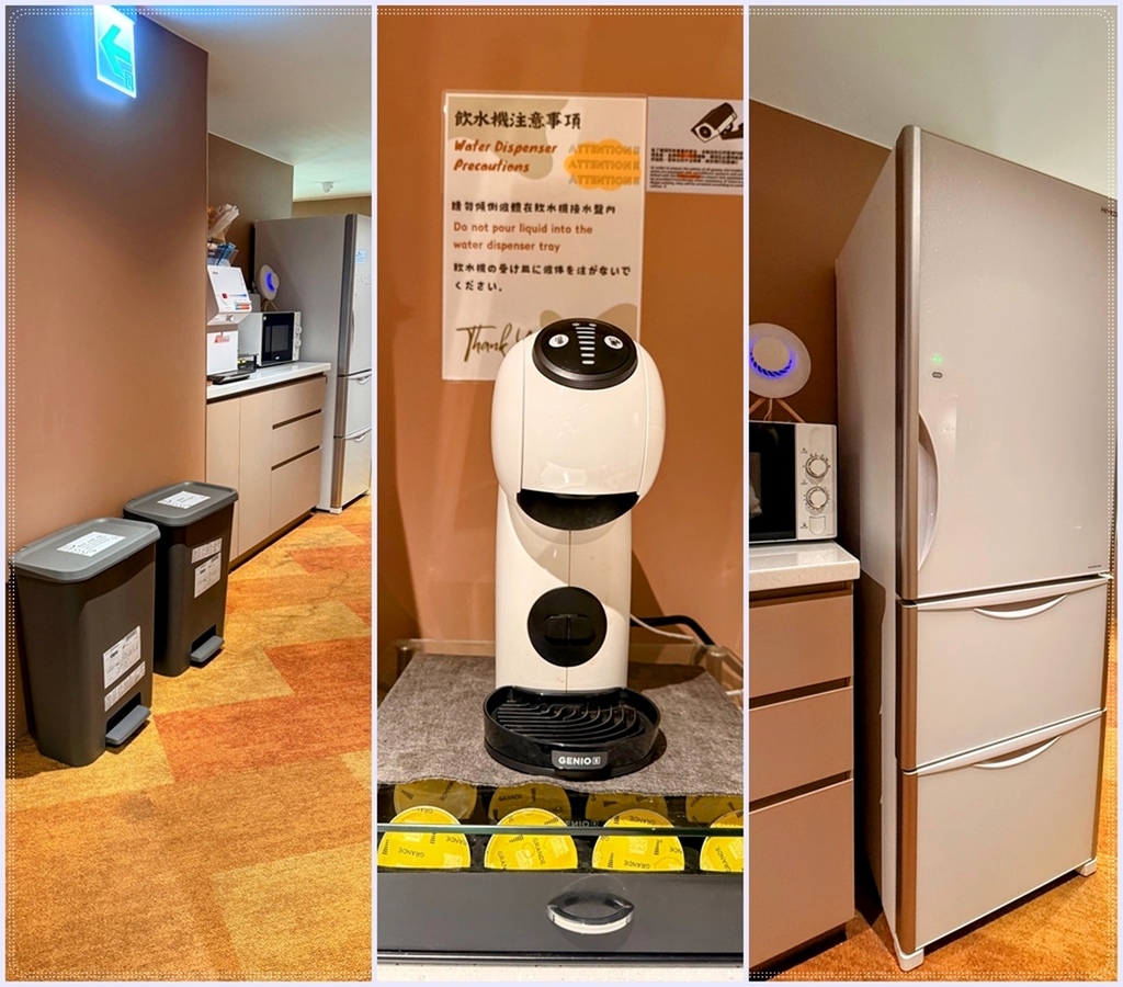 之後路過長廊就是有垃圾桶、飲水機&茶包、咖啡機、微波爐、冰箱等等.....一應俱全